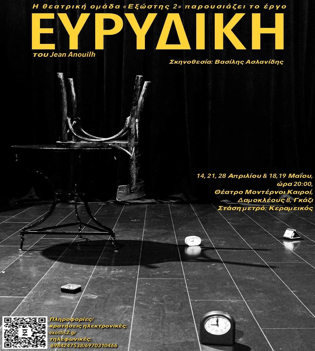 Η "Ευρυδίκη" (1941) του Ζαν Ανούιγ, αποτελεί μέρος των "μαύρων" θεατρικών έργων του συγγραφέα, και γράφτηκε στην περίοδο των "ελληνικών" έργων του (1941-46). Ο αρχαίος μύθος του Ορφέα και της Ευρυδίκης, αυτή η τραγωδία του Έρωτα και του Θανάτου, χρησιμοποιείται από τον Ανούιγ για να μας δώσει τον δικό του "κόσμο", μέσα από έναν κόσμο που έχει ξεπεράσει τις διαστάσεις του χρόνου. Γι αυτό και ο χρόνος στο έργο δεν έχει τη δύναμη να επηρεάσει τις ζωές των ανθρώπων και μόνο σαν σύμβαση μπορεί να γίνει κατανοητός. Το ένα εικοσιτετράωρο του έρωτα της Ευρυδίκης για τον Ορφέα, έχει μεγαλύτερη αντοχή στο χρόνο από όλους τους προηγούμενους έρωτές της, καθώς η ποιότητα της αξιοποίησής του είναι πιο δυνατή συνισταμένη από την ποσότητά του. Ακόμα και ο θάνατος σαν αντίπαλος, αλλά και σαν σύμμαχος του έρωτα, έχει το δικό του ρολόι, που μόνο για συμβολικούς λόγους λειτουργεί.